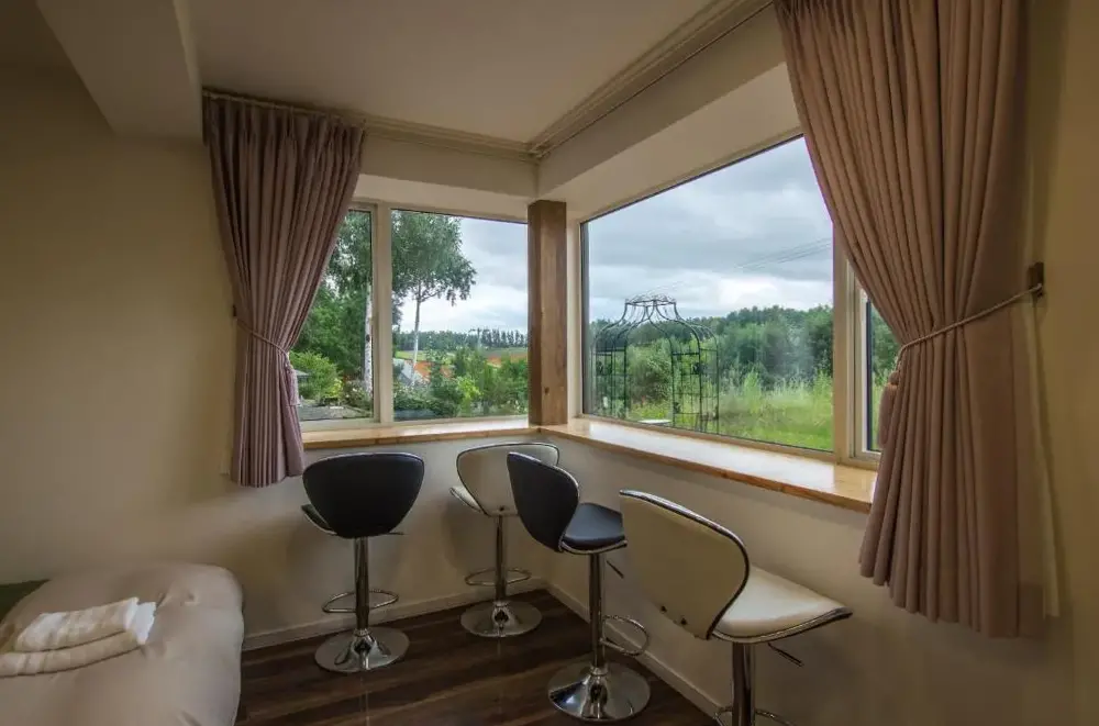 テーブルがない。出窓の台はカーテンを閉めると使えない。歯ブラシ、お茶がない。室内に非常口誘導灯がついていて夜中まぶしい。